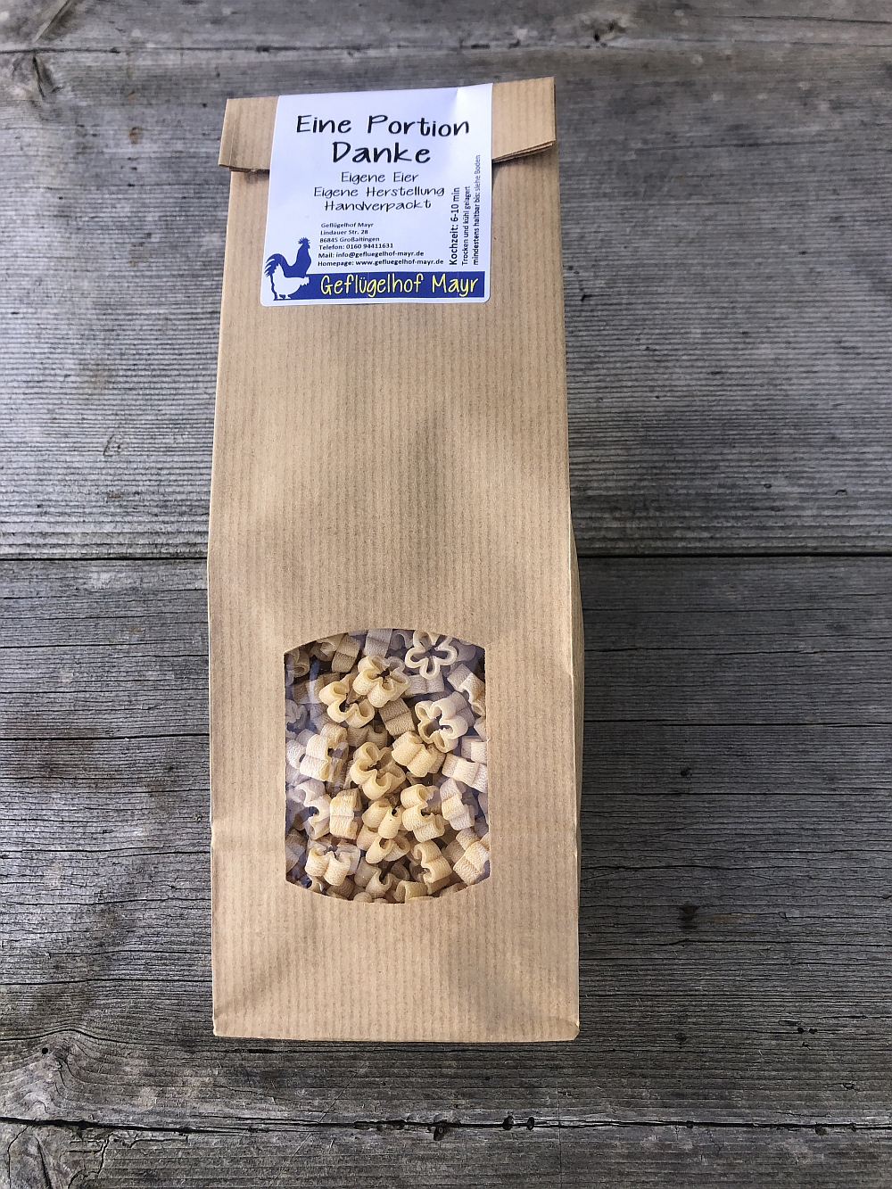 Unsere Nudeln werden aus 100 % Hartweizengrieß und je Kilo mit 6 frisch aufgeschlagenen Eiern, bei uns auf dem Hof hergestellt.