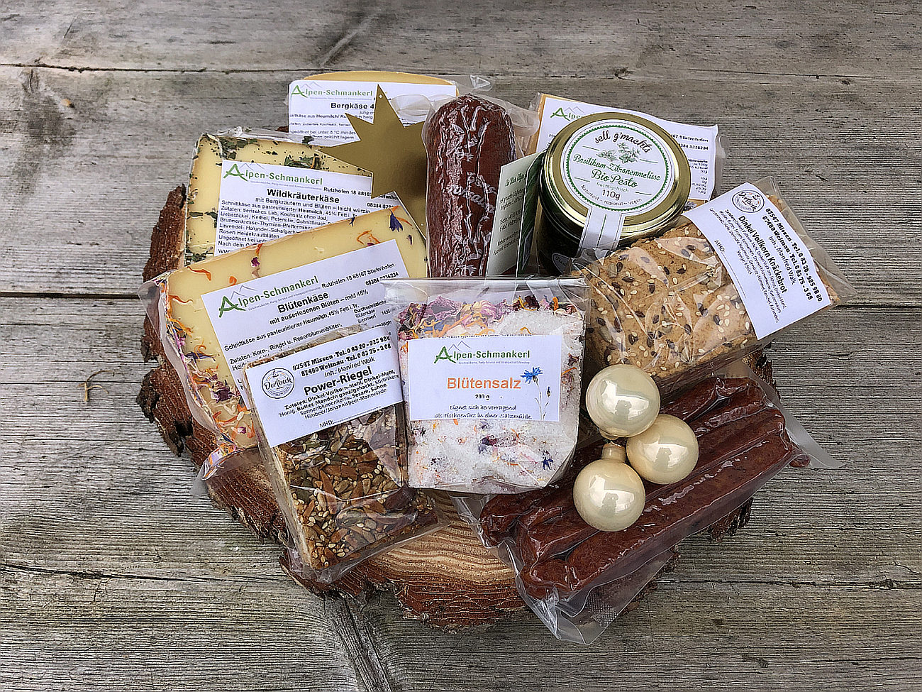 Mit Begeisterung erstellen wir individuelle Geschenke nach Ihren Vorstellungen. Die Produkte können Sie nach Lust und Laune zusammenstellen. Ob es ein Geschenkkorb für einen Geburtstag oder für festliche Anlässe wie Hochzeit, Jubiläen oder Weihnachten sein darf, wir fertigen diesen kreativ für Sie. Ich freue mich hierfür über einen Anruf unter Tel. 08384 8236234 oder eine Mail an info@alpen-schmankerl.de, um Ihre individuellen Wünsche entgegenzunehmen!