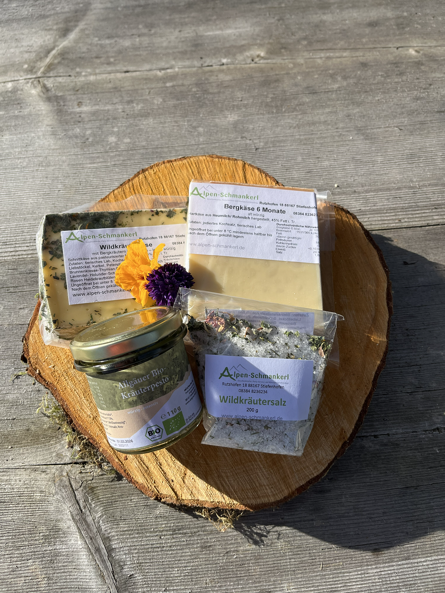Die Produkte liegen auf einer Naturholzscheibe mit duftendem Allgäuer Bergkräuter-Heu und sind liebevoll mit Folie,