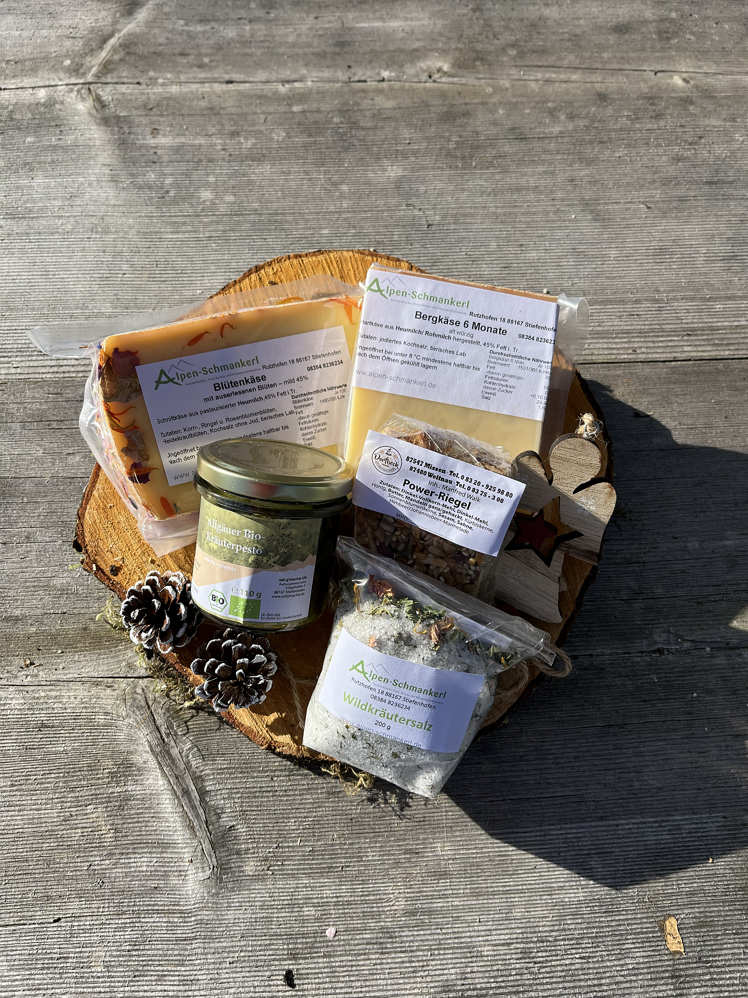 Mit Begeisterung erstellen wir individuelle Geschenke nach Ihren Vorstellungen. Die Produkte können Sie nach Lust und Laune zusammenstellen. Ob es ein Geschenkkorb für einen Geburtstag oder für festliche Anlässe wie Hochzeiten, Jubiläen oder Weihnachten sein darf, wir fertigen diesen kreativ für Sie.Ich freue mich hierfür über einen Anruf unter Tel. 08384 8236234 oder eine Mail an info@alpen-schmankerl.de um Ihre individuellen Wünsche entgegenzunehmen!