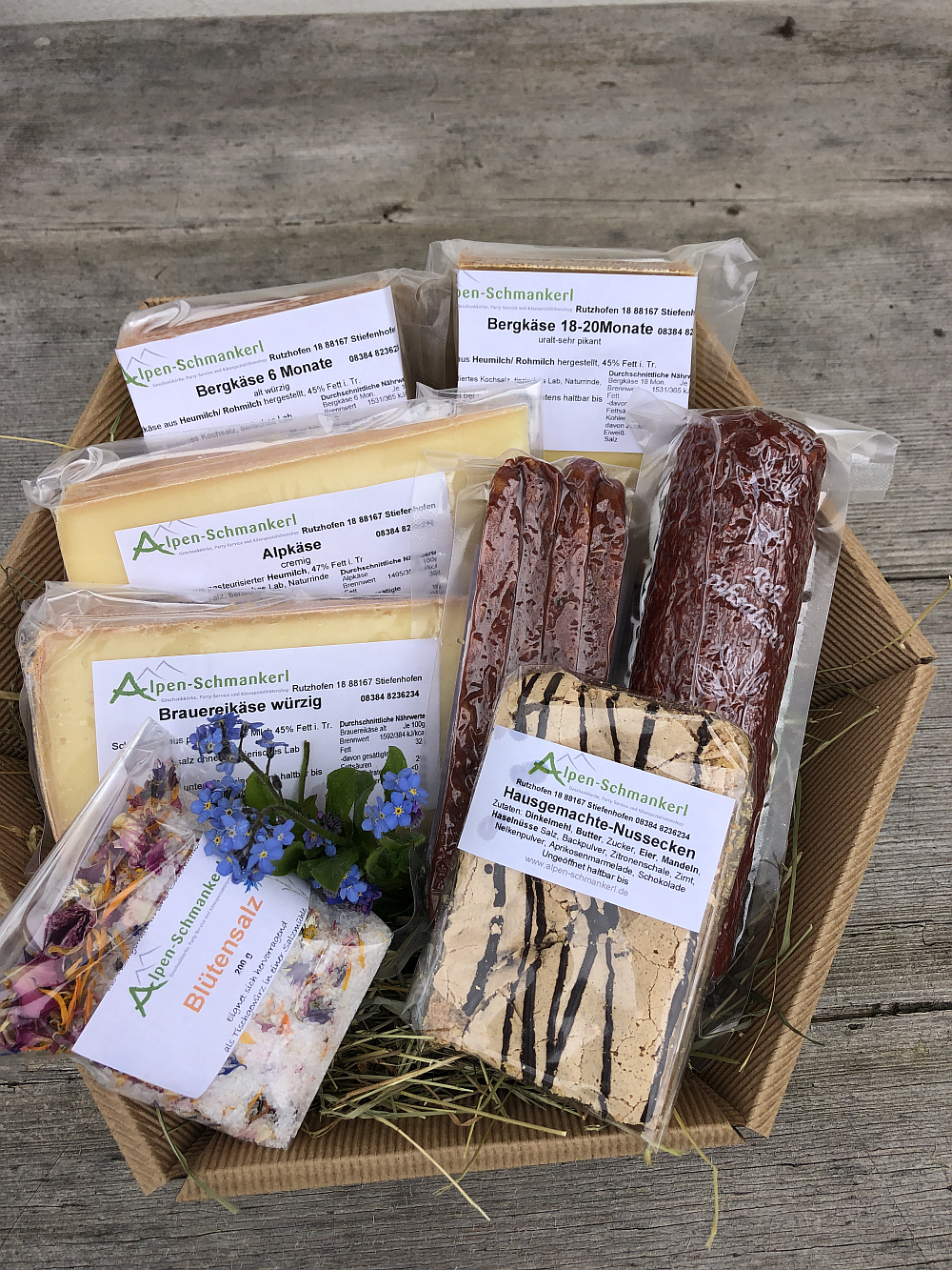 Die Produkte sind in einem Wellpappe-Präsentkorb mit duftendem Allgäuer Berg-Kräuter-Heu und liebevoll mit Folie, Deko-Schleife verpackt.