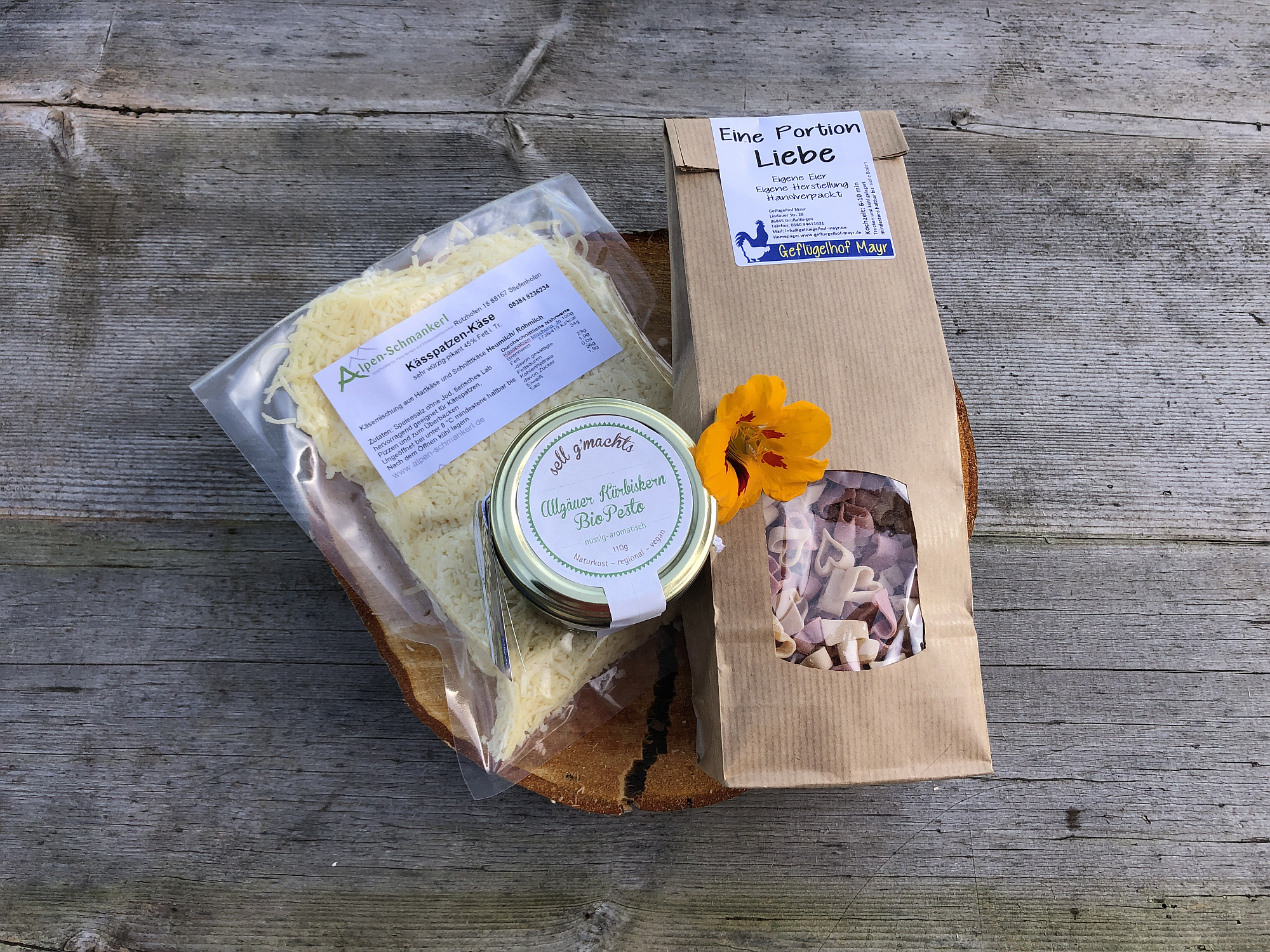 Die Produkte liegen suf einem Natur Holzbrett mit duftendem Allgäuer Berg-Kräuter-Heu und sind liebevoll mit Folie, Deko-Schleife verpackt.